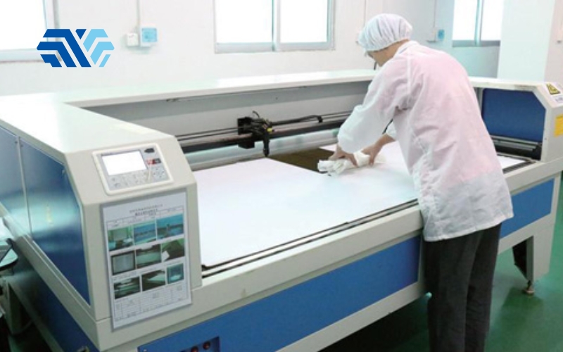 Sau khi dệt, vải sẽ được cắt thành từng kích thước tiêu chuẩn bằng công nghệ laser. Đây là bước quan trọng giúp tạo ra mép cắt kín, không bị bung sợi. So với phương pháp cắt thông thường, cắt laser giúp giảm đáng kể nguy cơ phát sinh bụi từ mép khăn trong quá trình sử dụng.